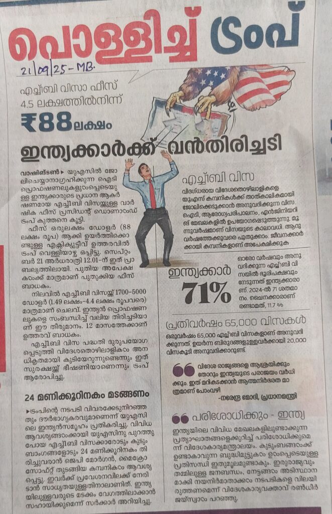 H1 B Visa : ഫീസ് 88 ലക്ഷം; ഇന്ത്യക്കാർക്ക് വൻ തിരിച്ചടി By admin | 25/09/2025 - 2:32 PM |25/09/2025 SOCIAL Bookmark the permalink.