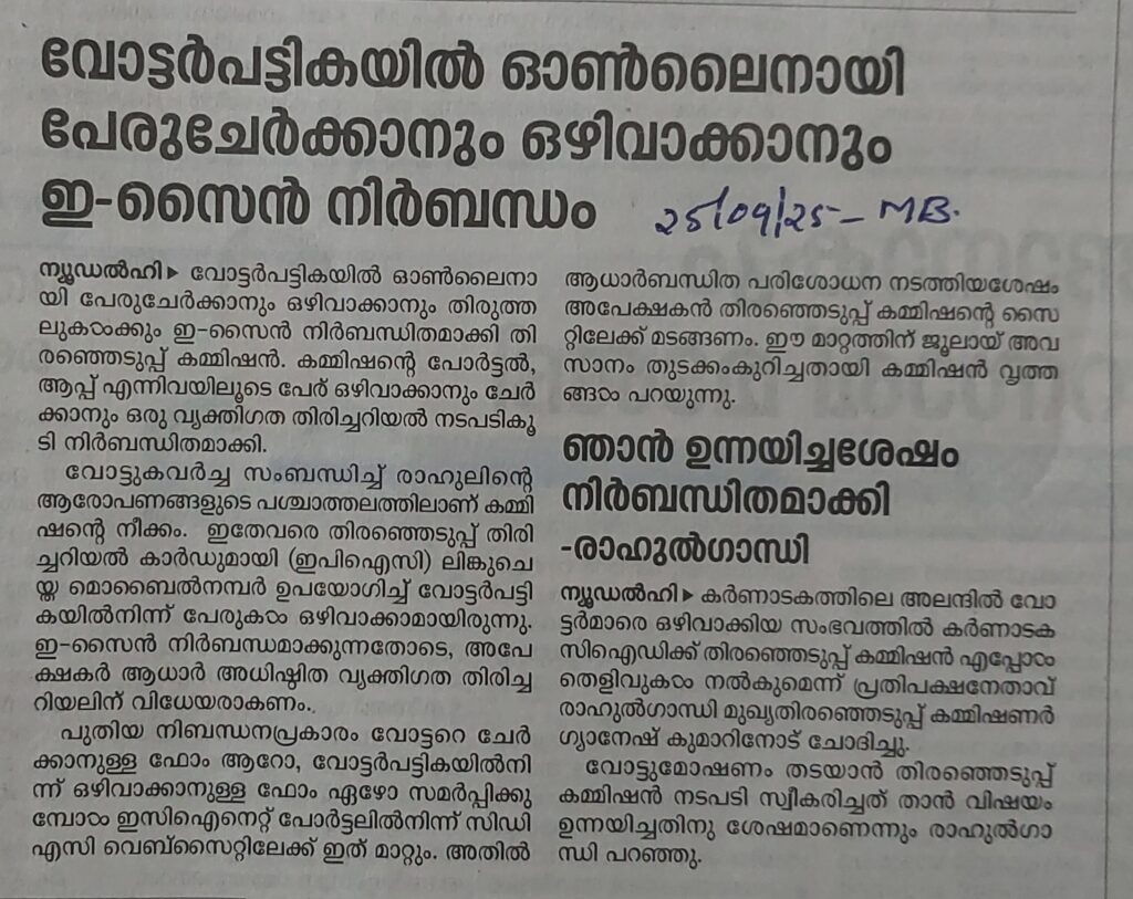 വോട്ടർ പട്ടികയിൽ ഓൺലൈനായി പേര് ചേർക്കാനും ഒഴിവാക്കാനും ഇ- സൈൻ നിർബന്ധം By admin | 25/09/2025 - 2:47 PM |25/09/2025 SOCIAL Bookmark the permalink.