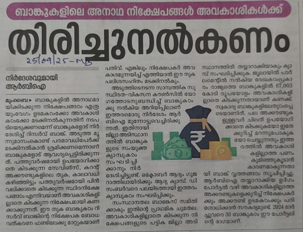 ബാങ്കുകളിലെ അനാഥ നിക്ഷേപങ്ങൾ അവകാശികൾക്ക് തിരിച്ചു നൽകണം- RBI By admin | 25/09/2025 - 2:51 PM |25/09/2025 SOCIAL Bookmark the permalink.