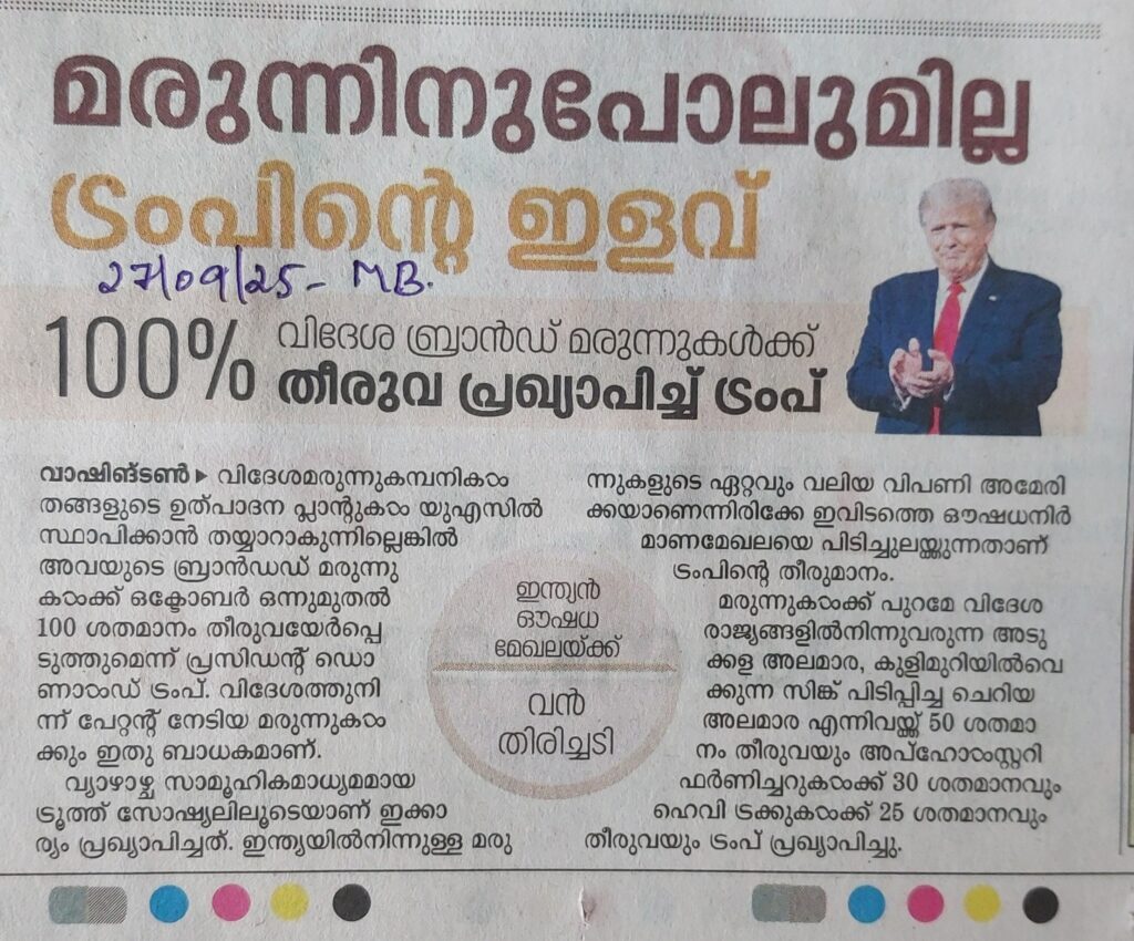 വിദേശ ബ്രാൻഡ് മരുന്നുകൾക്ക് 100% തീരുവ പ്രഖ്യാപിച്ച് ട്രംപ് By admin | 27/09/2025 - 10:26 AM |27/09/2025 SOCIAL Bookmark the permalink.