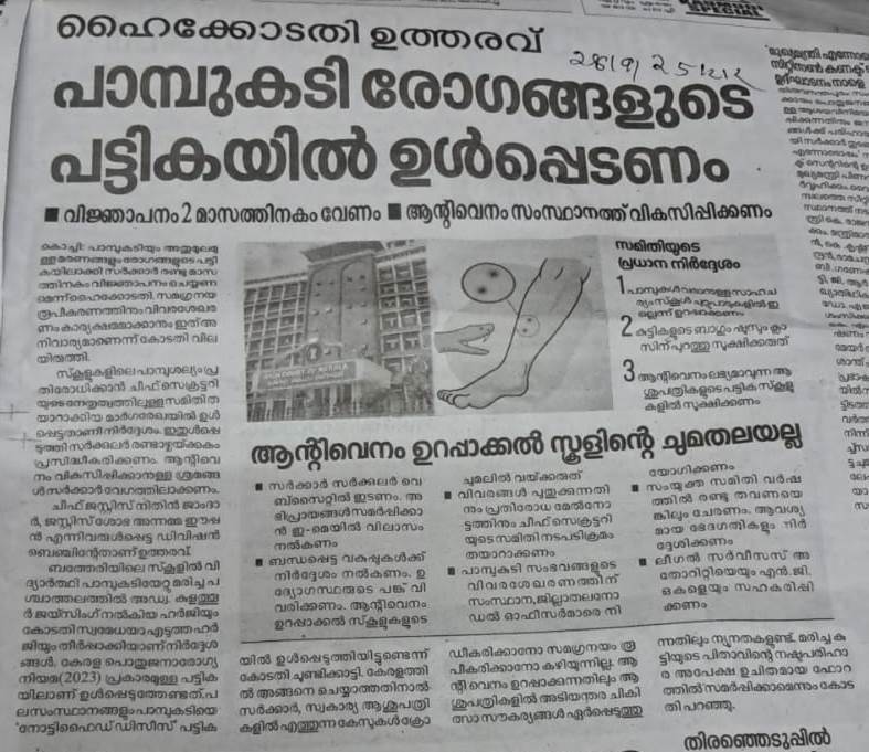 പാമ്പുകടി രോഗങ്ങളുടെ പട്ടികയിൽ ഉൾപ്പെടണം – ഹൈക്കോടതി By admin | 01/10/2025 - 2:22 AM |01/10/2025 JUDICIARY Bookmark the permalink.