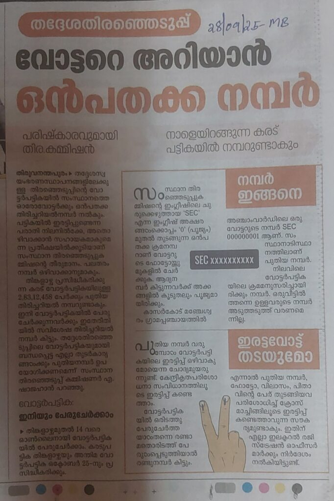 തദ്ദേശ തെരഞ്ഞെടുപ്പ് : വോട്ടർ അറിയാൻ ഒൻപതക്ക നമ്പർ By admin | 01/10/2025 - 2:40 AM |01/10/2025 SOCIAL Bookmark the permalink.
