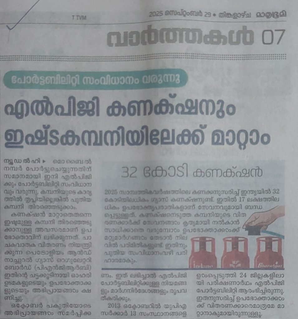 എൽപിജി കണക്ഷനും ഇഷ്ട കമ്പനിയിലേക്ക് മാറ്റാം; പോർട്ടബിലിറ്റി സംവിധാനം വരുന്നു By admin | 01/10/2025 - 2:49 AM |01/10/2025 SOCIAL Bookmark the permalink.