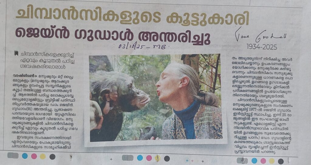 ചിമ്പാൻസികളുടെ കൂട്ടുകാരി ജെയിൻ ഗുഡാൽ അന്തരിച്ചു By admin | 03/10/2025 - 10:27 AM |03/10/2025 ENVIRONMENT Bookmark the permalink.