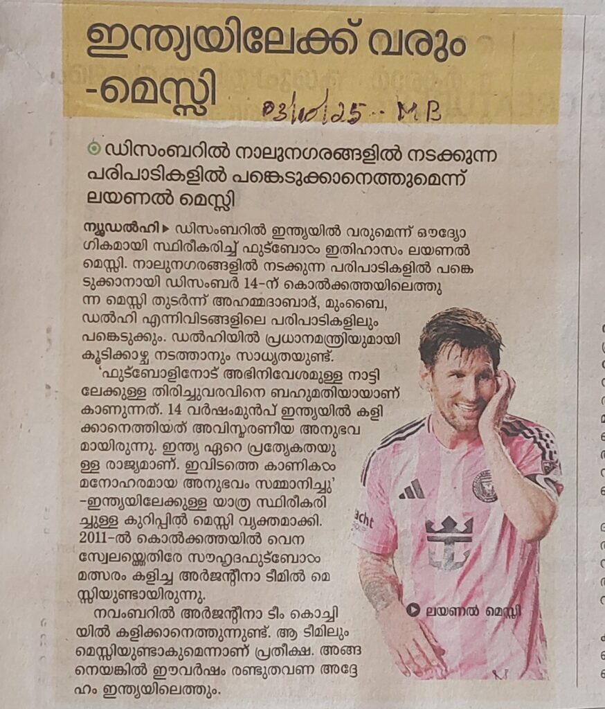 ഇന്ത്യയിലേക്ക് വരും – മെസ്സി By admin | 03/10/2025 - 10:31 AM |03/10/2025 SOCIAL Bookmark the permalink.