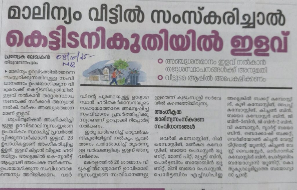 മാലിന്യം വീട്ടിൽ സംസ്കരിച്ചാൽ കെട്ടിട നികുതിയിൽ ഇളവ് By admin | 10/10/2025 - 2:22 AM |10/10/2025 SOCIAL Bookmark the permalink.