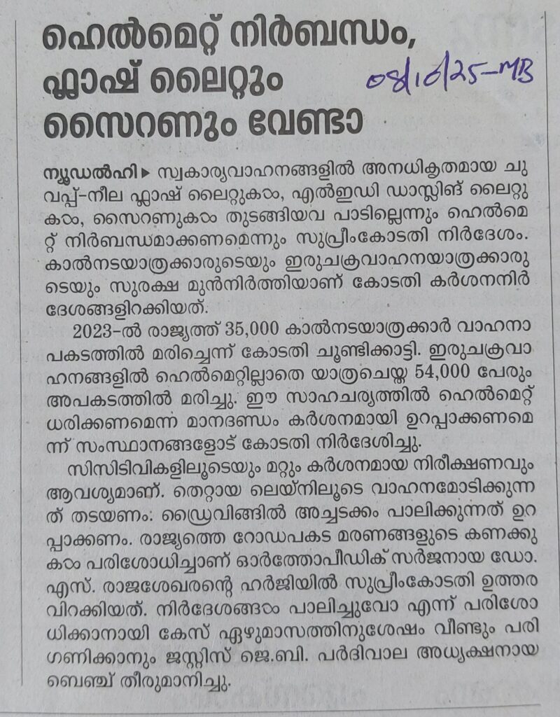 ഹെൽമറ്റ് നിർബന്ധം, ഫ്ലാഷ് ലൈറ്റും സഹകരണം വേണ്ട By admin | 10/10/2025 - 2:24 AM |10/10/2025 SOCIAL Bookmark the permalink.