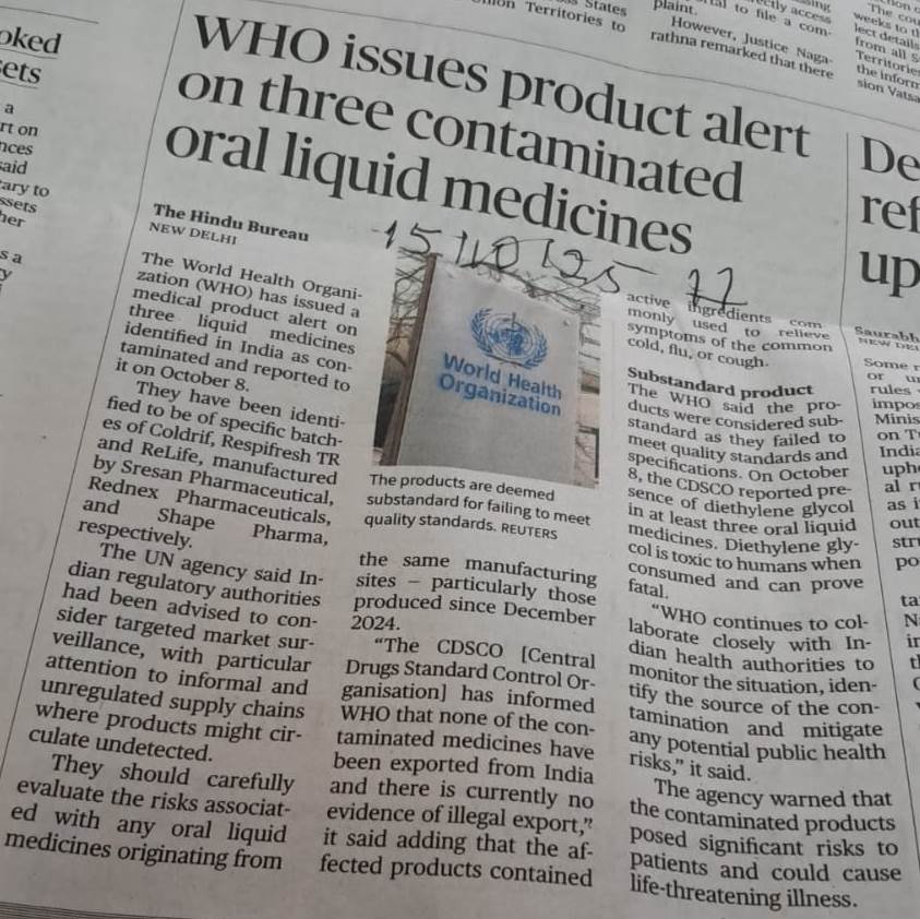 WHO issues product alert on three contaminated oral liquid medicines By admin | 17/10/2025 - 1:37 AM |17/10/2025 HEALTH Bookmark the permalink.