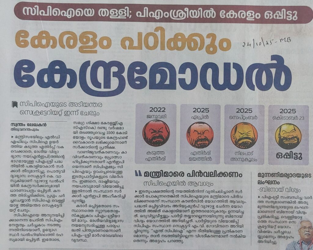 പി എം ശ്രീയിൽ കേരളം ഒപ്പിട്ടു By admin | 24/10/2025 - 3:55 PM |24/10/2025 EDUCATION AND CAREER Bookmark the permalink.