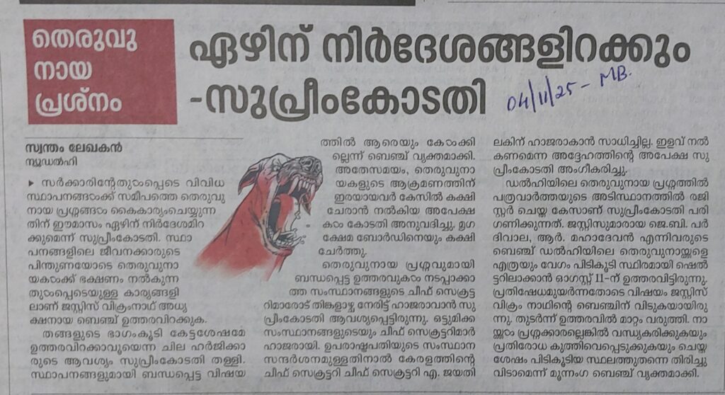 തെരുവുനായ പ്രശ്നം : ഏഴിന് നിർദ്ദേശങ്ങൾ ഇറക്കം സുപ്രീം കോടതി By admin | 06/11/2025 - 2:17 AM |06/11/2025 SOCIAL Bookmark the permalink.