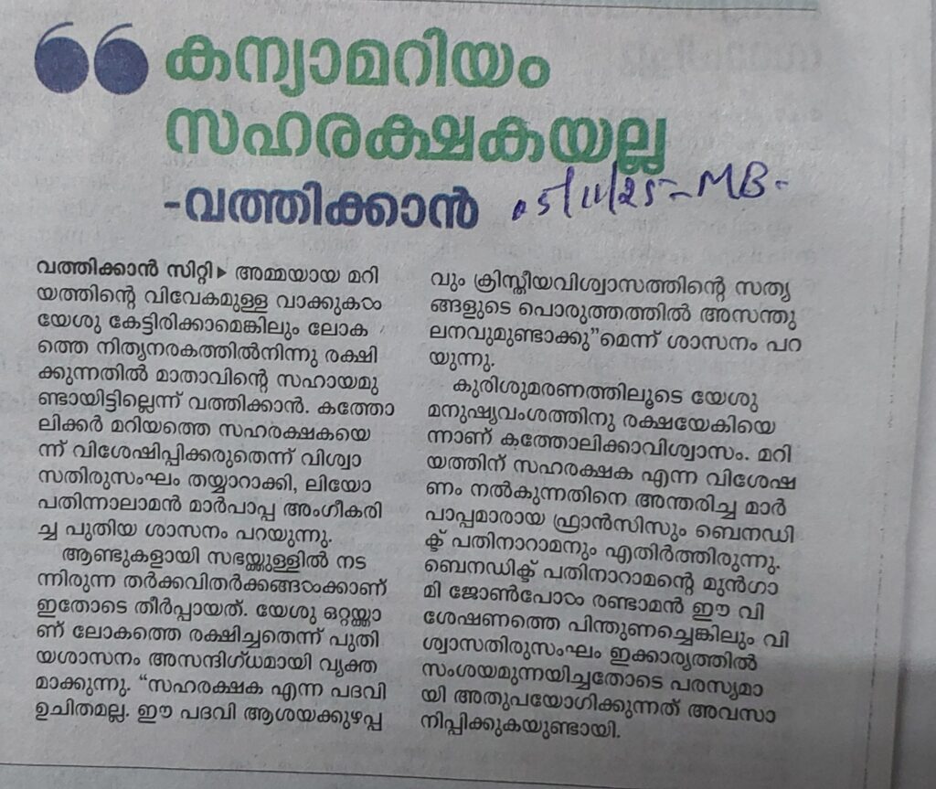 കന്യാമറിയം സഹരക്ഷകയല്ല വത്തിക്കാൻ By admin | 06/11/2025 - 2:21 AM |06/11/2025 SOCIAL Bookmark the permalink.