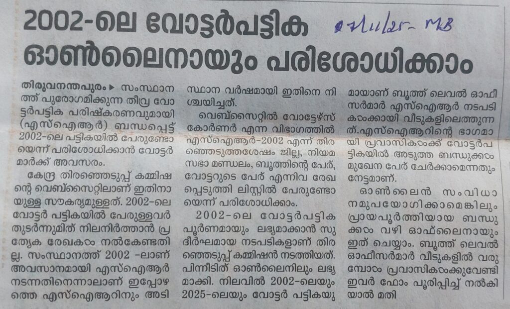 2002-ലെ വോട്ടർപട്ടിക ഓൺലൈനായും പരിശോധിക്കാം By admin | 07/11/2025 - 10:27 AM |07/11/2025 SOCIAL Bookmark the permalink.