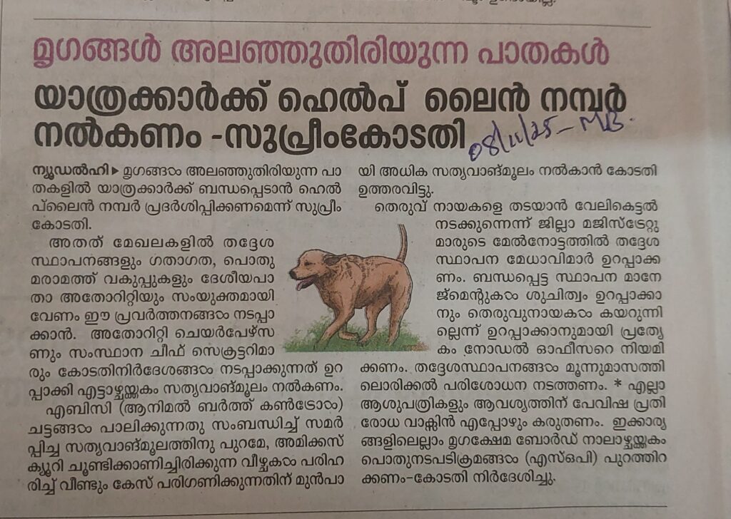 മൃഗങ്ങൾ അലഞ്ഞു തിരിയുന്ന പാതകൾ : യാത്രക്കാർക്ക് ഹെൽപ്പ് ലൈൻ നമ്പർ നൽകണം – സുപ്രീംകോടതി. By admin | 14/11/2025 - 1:36 AM |14/11/2025 JUDICIARY, SOCIAL Bookmark the permalink.