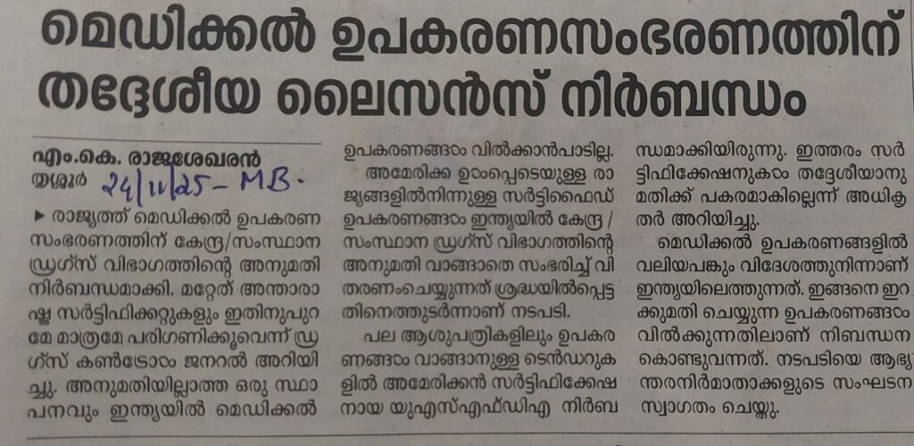 മെഡിക്കൽ ഉപകരണസംഭരണത്തിന് തദ്ദേശീയ ലൈസൻസ് നിർബന്ധം By admin | 28/11/2025 - 1:43 AM |28/11/2025 HEALTH Bookmark the permalink.