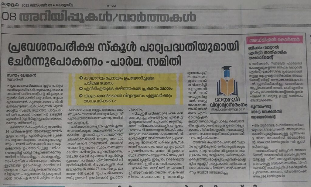 പ്രവേശനപരീക്ഷ സ്കൂൾ പാഠ്യപദ്ധതിയുമായി ചേർന്നു പോകണം, പാർലമെന്റ് സമിതി. By admin | 11/12/2025 - 9:11 AM |11/12/2025 EDUCATION AND CAREER Bookmark the permalink.