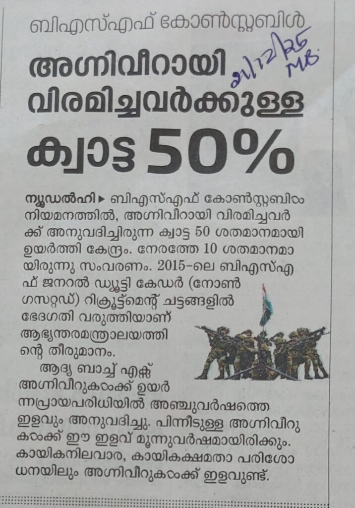 B.S.F. കോൺസ്റ്റബിൾ – അഗ്നിവീറായി വിരമിച്ചവർക്കുള്ള ക്വാട്ട 50 ശതമാനം By admin | 22/12/2025 - 2:36 PM |22/12/2025 SOCIAL Bookmark the permalink.