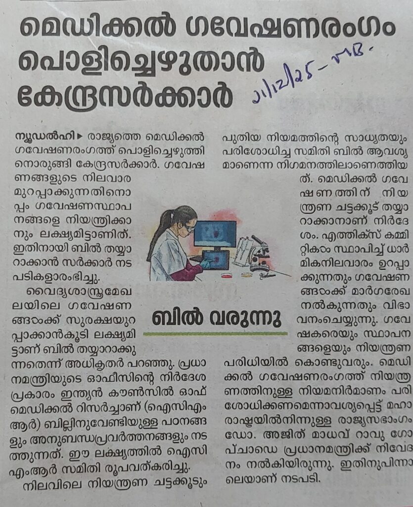 മെഡിക്കൽ ഗവേഷണരംഗം പൊളിച്ചെഴുതാൻ കേന്ദ്രസർക്കാർ By admin | 22/12/2025 - 3:30 PM |22/12/2025 SOCIAL Bookmark the permalink.