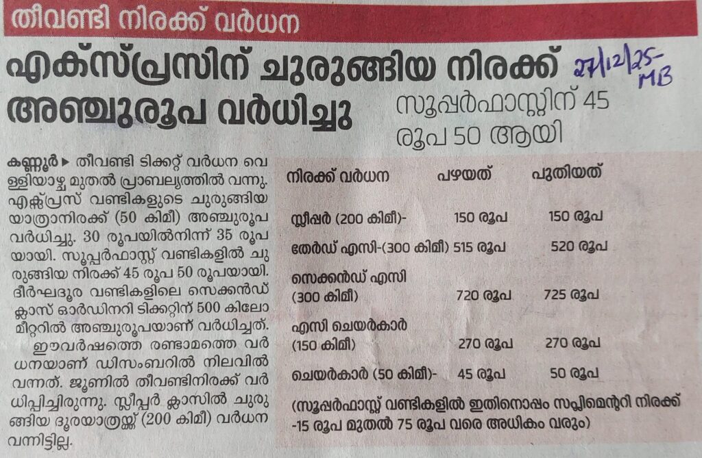 തീവണ്ടി നിരക്ക് വർദ്ധന