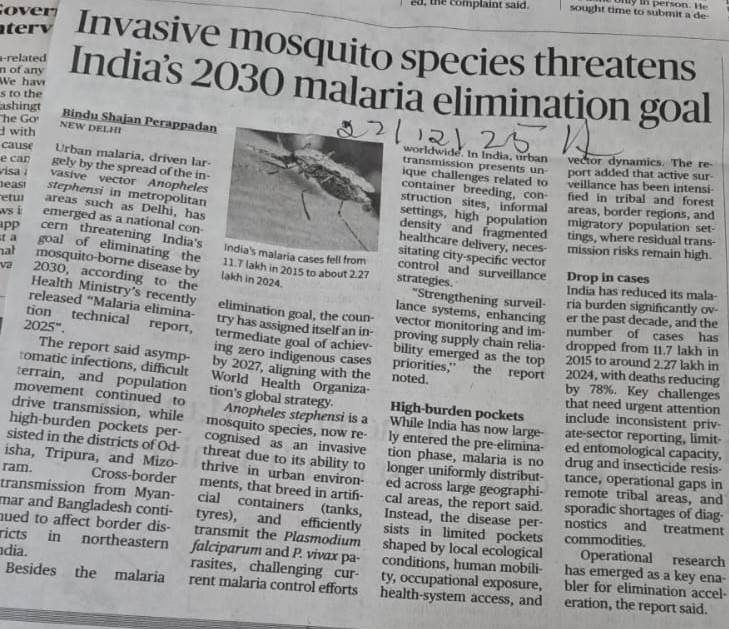 Invasive mosquito species threatens India’s 2030 malaria elimination goal By admin | 30/12/2025 - 7:49 AM |30/12/2025 HEALTH Bookmark the permalink.