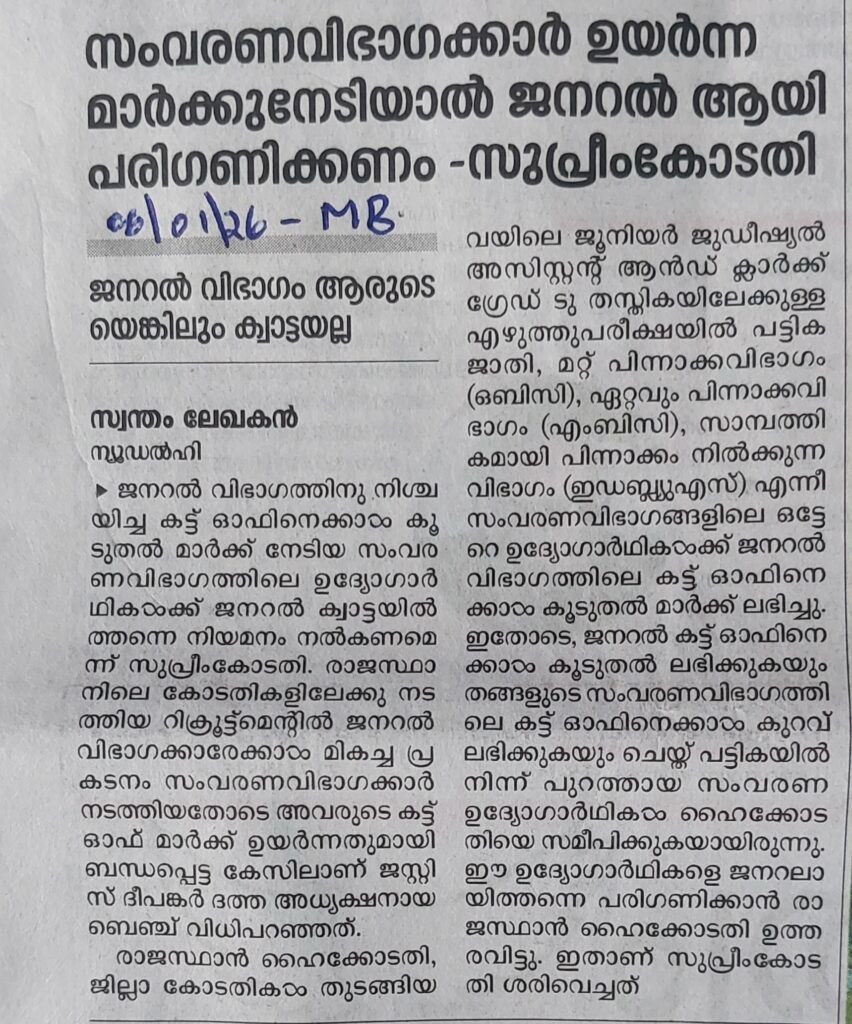 സംവരണ വിഭാഗക്കാർ ഉയർന്ന മാർക്ക് നേടിയാൽ ജനറൽ ആയി പരിഗണിക്കണം – സുപ്രീം കോടതി By admin | 07/01/2026 - 2:34 PM |07/01/2026 JUDICIARY, SOCIAL Bookmark the permalink.