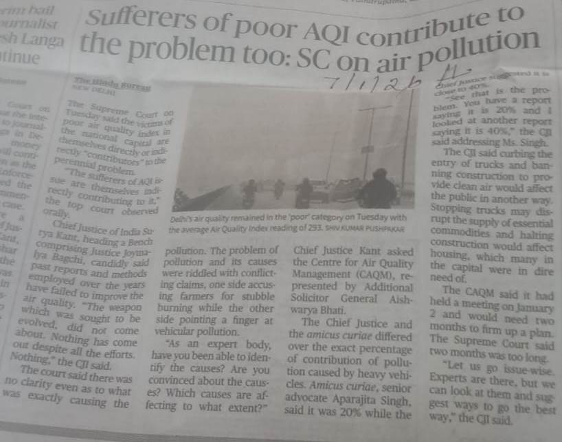 Sufferers of poor AQI contribute to the problem too : SC on air pollution By admin | 07/01/2026 - 4:13 PM |07/01/2026 JUDICIARY, SOCIAL Bookmark the permalink.