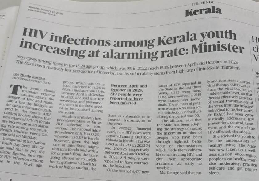 HIV infections among Kerala youth increasing at alarming rate : Mininster By admin | 15/01/2026 - 6:49 AM |15/01/2026 HEALTH Bookmark the permalink.