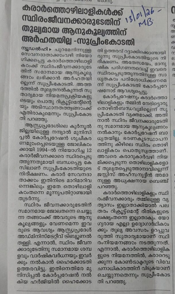 കരാർ തൊഴിലാളികൾക്ക് സ്ഥിരം ജീവനക്കാരുടേതിന് തുല്യമായ ആനുകൂല്യത്തിന് അർഹതയില്ല – സുപ്രീം കോടതി By admin | 15/01/2026 - 6:52 AM |15/01/2026 JUDICIARY Bookmark the permalink.