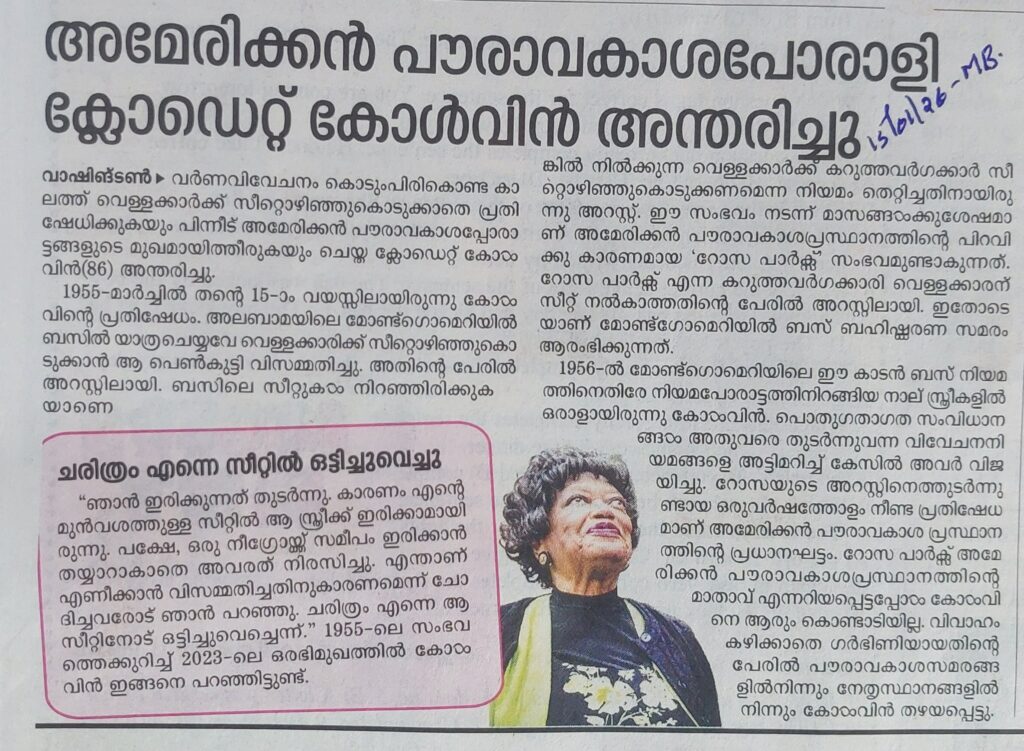 പൗരാവകാശപോരാളി ക്ലോഡിറ്റ് കോൾവിൻ അന്തരിച്ചു By admin | 16/01/2026 - 10:40 AM |16/01/2026 SOCIAL Bookmark the permalink.