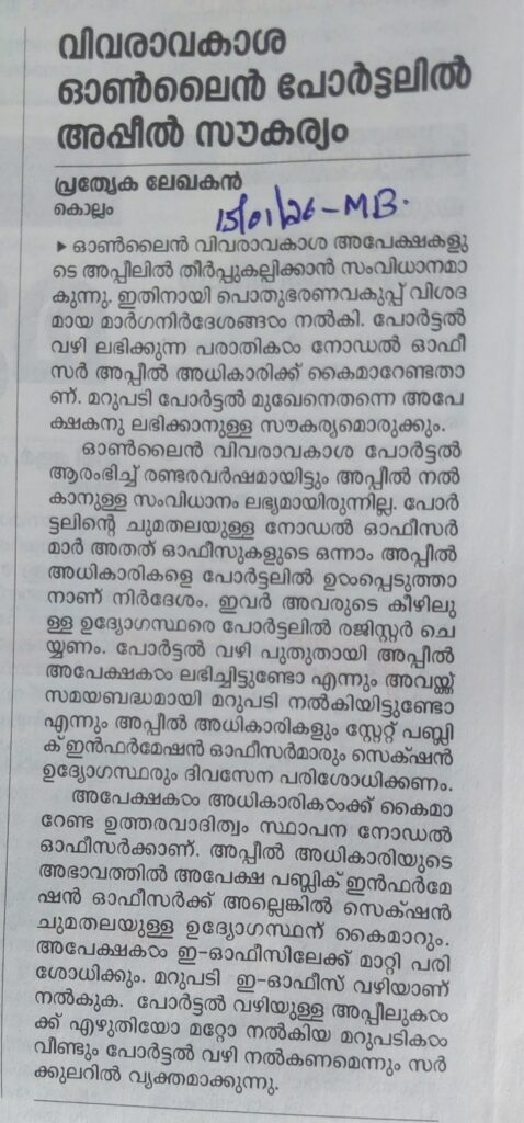 വിവരാവകാശ ഓൺലൈൻ പോർട്ടലിൽ അപ്പീൽ സൗകര്യം By admin | 16/01/2026 - 10:45 AM |16/01/2026 SOCIAL Bookmark the permalink.