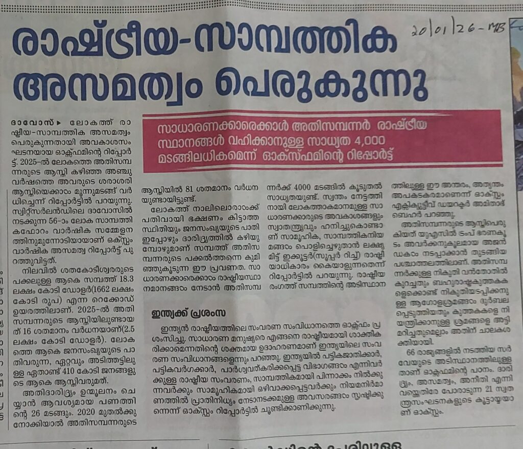 രാഷ്ട്രീയ സാമ്പത്തിക അസമത്വം പെരുകുന്നു By admin | 23/01/2026 - 2:42 AM |23/01/2026 SOCIAL Bookmark the permalink.