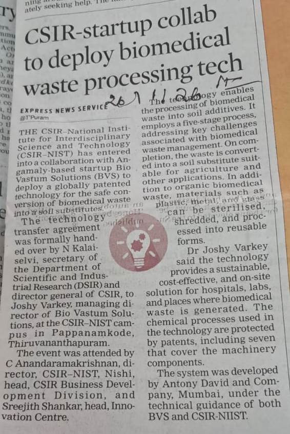 CSIR-startup collab to deploy biomedical waste processing tech By admin | 27/01/2026 - 2:01 AM |27/01/2026 WASTE MANAGEMENT Bookmark the permalink.