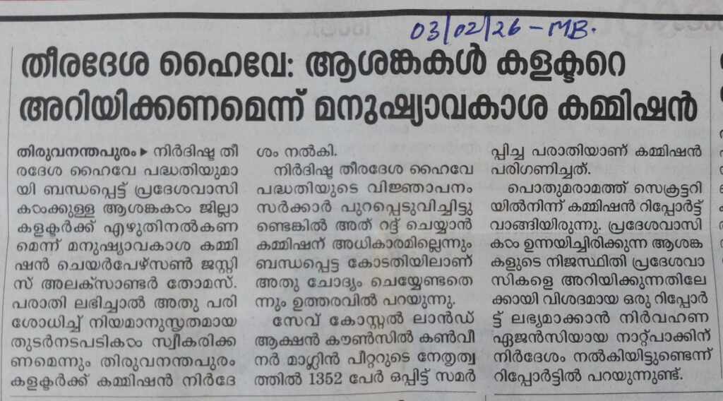 തീരദേശ ഹൈവേ ആശങ്കകൾ കളക്ടറെ അറിയിക്കണമെന്ന് മനുഷ്യാവകാശ കമ്മിഷൻ By admin | 04/02/2026 - 3:08 AM |04/02/2026 SOCIAL Bookmark the permalink.