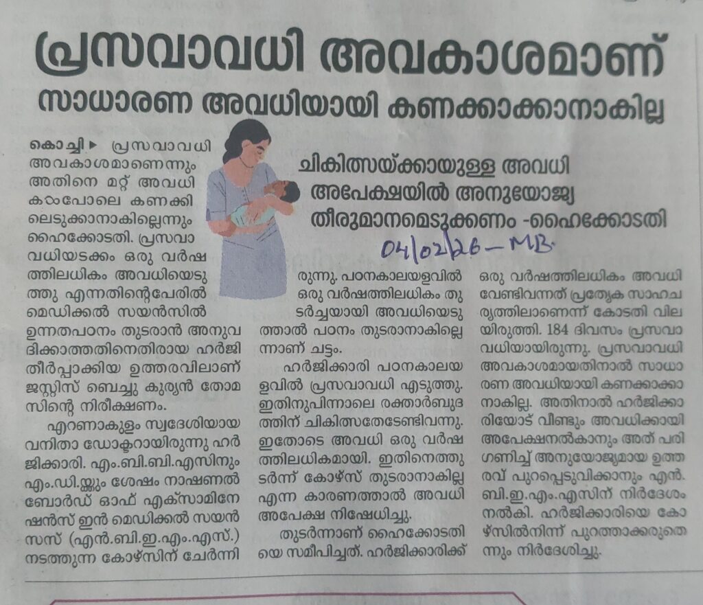 പ്രസവാവധി അവകാശമാണ് സാധാരണ അവധിയായി കണക്കാക്കാൻ ആകില്ല -ഹൈക്കോടതി By admin | 04/02/2026 - 3:20 AM |04/02/2026 SOCIAL Bookmark the permalink.