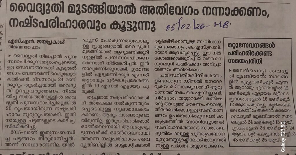 വൈദ്യുതി മുടങ്ങിയാൽ അതിവേഗം നന്നാക്കണം; നഷ്ടപരിഹാരവും കൂട്ടുന്നു By admin | 05/02/2026 - 1:06 PM |05/02/2026 SOCIAL Bookmark the permalink.