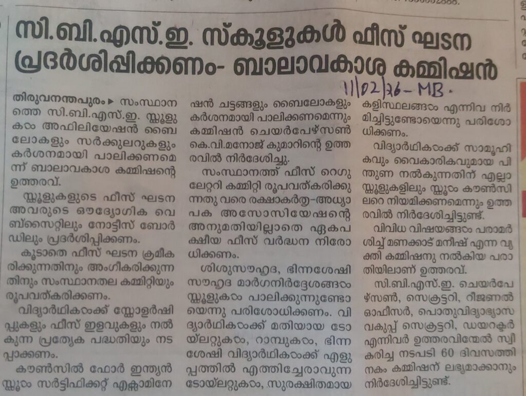 G.B.S.E.സ്കൂളുകൾ ഫീസ് ഘടന പ്രദർശിപ്പിക്കണം – ബാലാവകാശ കമ്മിഷൻ By admin | 12/02/2026 - 2:00 PM |12/02/2026 EDUCATION AND CAREER Bookmark the permalink.