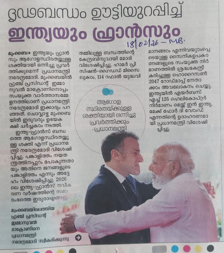 ദൃഢബന്ധം ഊട്ടിയുറപ്പിച്ച് ഇന്ത്യയും ഫ്രാൻസും By admin | 19/02/2026 - 11:33 AM |19/02/2026 SOCIAL Bookmark the permalink.