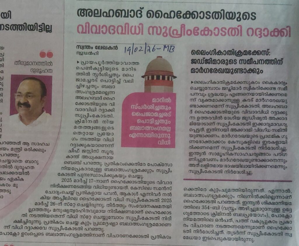 അലഹബാദ് ഹൈക്കോടതിയുടെ വിവാദ വിധി സുപ്രീംകോടതി റദ്ദാക്കി By admin | 19/02/2026 - 11:58 AM |19/02/2026 JUDICIARY Bookmark the permalink.