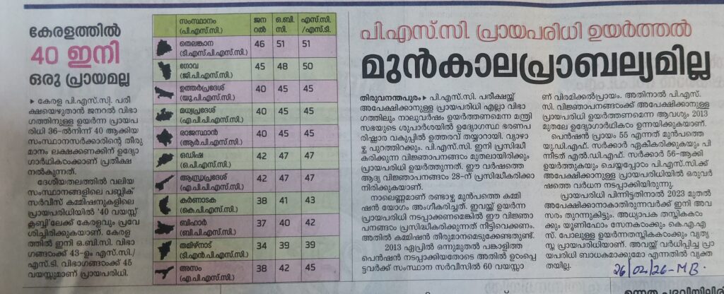PSC പ്രായപരിധി ഉയർത്തൽ; മുൻകാല പ്രാബല്യം ഇല്ല By admin | 27/02/2026 - 7:28 AM |27/02/2026 EDUCATION AND CAREER Bookmark the permalink.