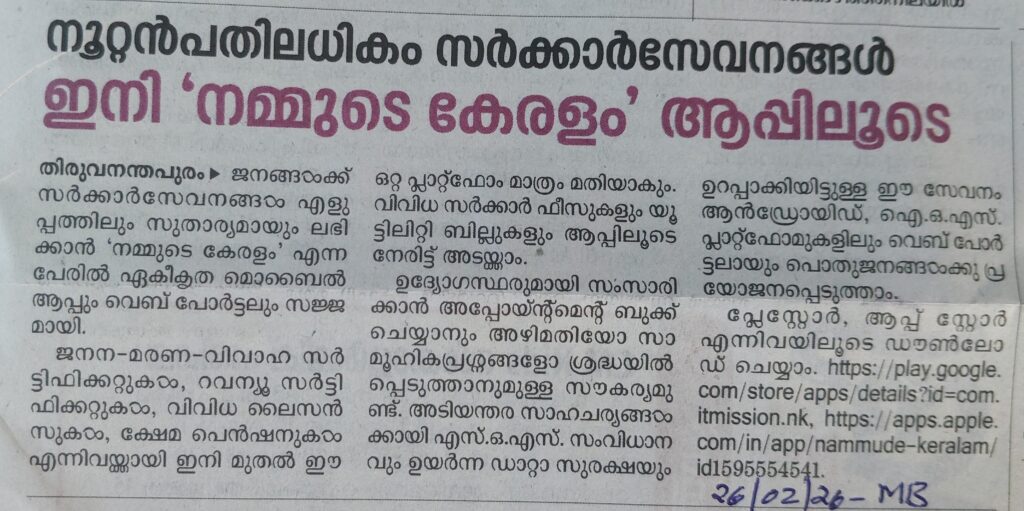 സർക്കാർ സേവനങ്ങൾ ഇനി ‘നമ്മുടെ കേരളം’ ആപ്പിലൂടെ By admin | 27/02/2026 - 7:31 AM |27/02/2026 SOCIAL Bookmark the permalink.