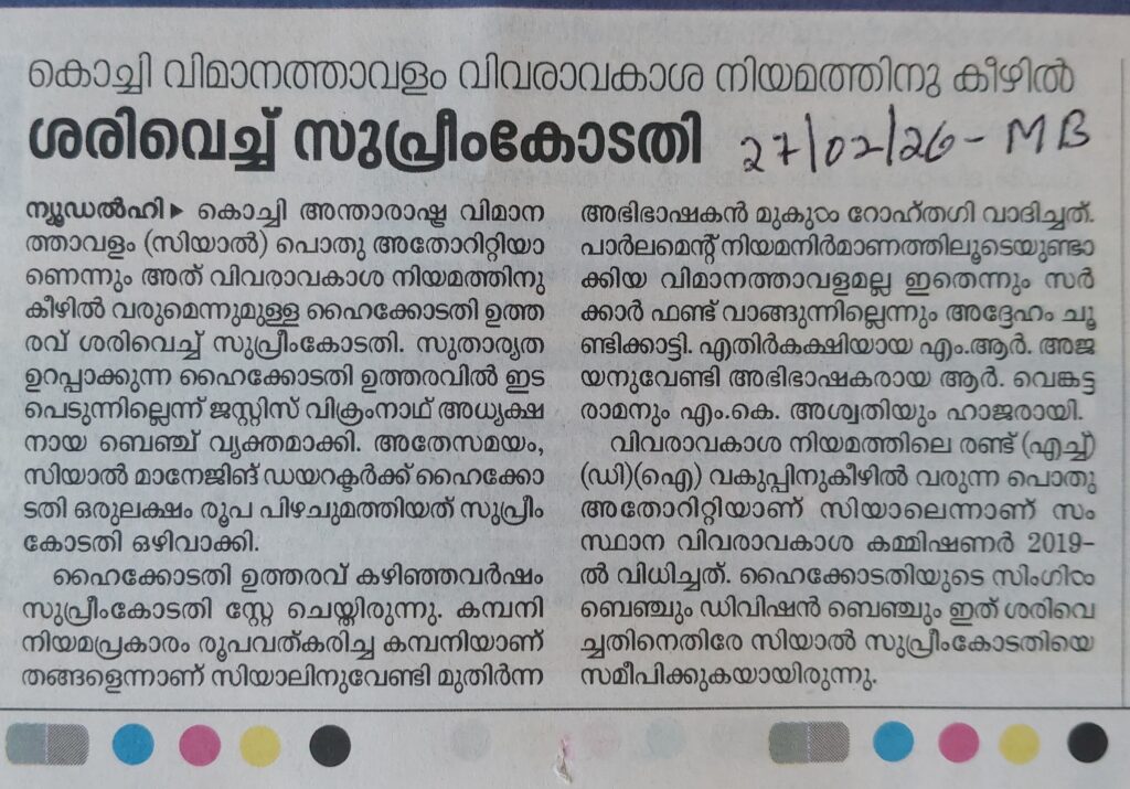 കൊച്ചി വിമാനത്താവളം വിവരാവകാശ നിയമത്തിന് കീഴിൽ : സുപ്രീം കോടതി By admin | 27/02/2026 - 7:48 AM |27/02/2026 JUDICIARY Bookmark the permalink.