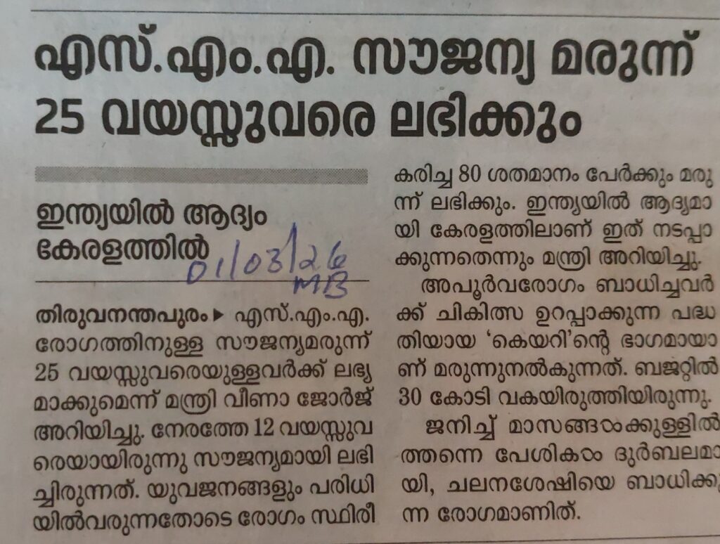എസ് എം എ സൗജന്യ മരുന്ന് 25 വയസ്സുവരെ ലഭിക്കും By admin | 01/03/2026 - 11:19 AM |01/03/2026 HEALTH Bookmark the permalink.