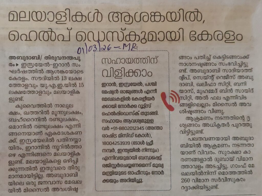 മലയാളികൾ ആശങ്കയിൽ, ഹെൽപ്പ് ഡെസ്കുമായി കേരളം By admin | 01/03/2026 - 11:34 AM |01/03/2026 SOCIAL Bookmark the permalink.