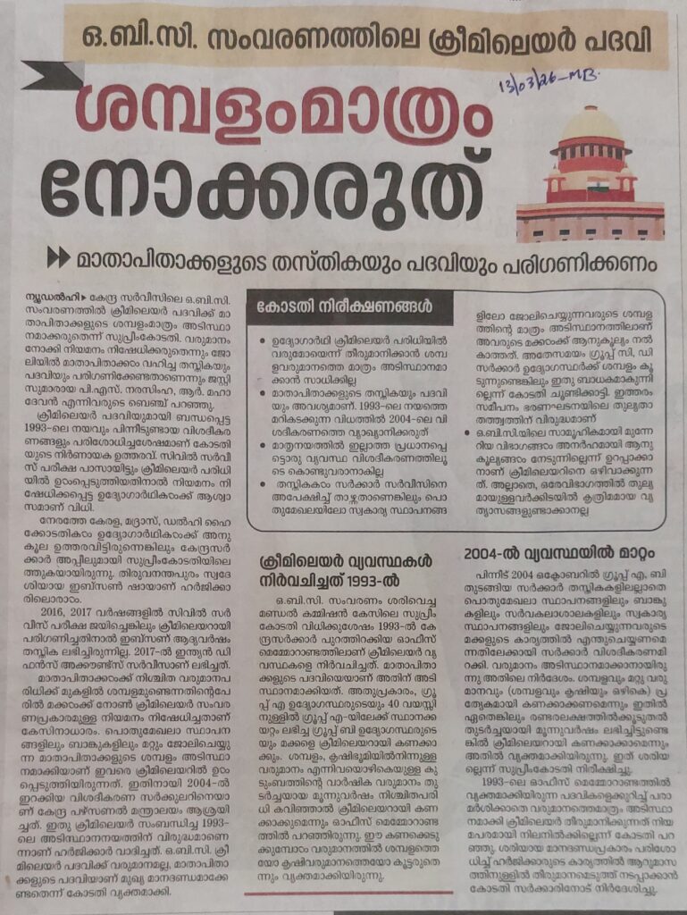 O.B.C.സംവരണത്തിലെ ക്രീമിലെയർ പദവി: ശംബളംമാത്രം നോക്കരുത് By admin | 13/03/2026 - 10:47 AM |13/03/2026 JUDICIARY, SOCIAL Bookmark the permalink.