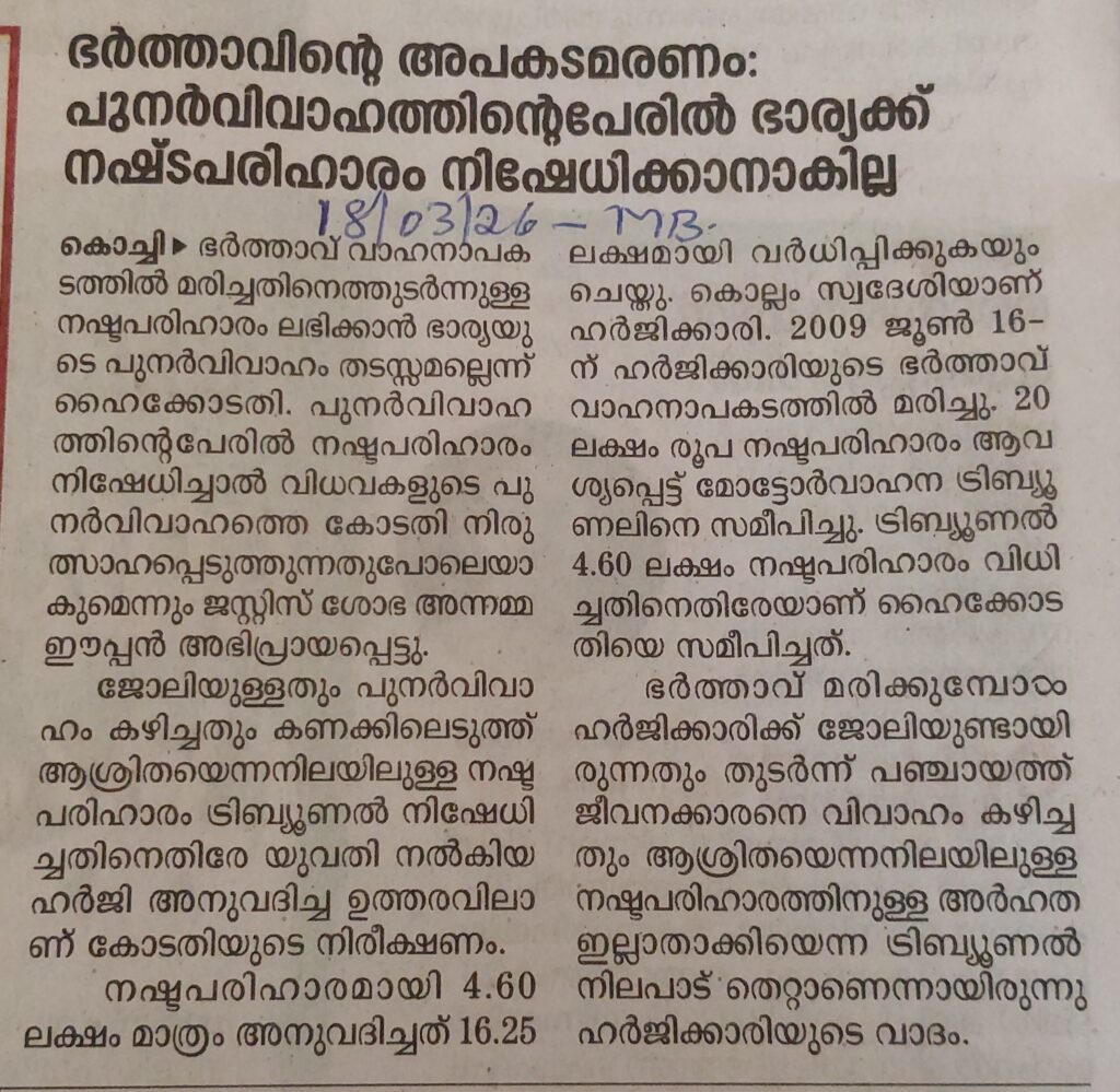 ഭർത്താവിന്റെ അപകടമരണം : പുനർവിവാഹത്തിന്റെപേരിൽ ഭാര്യക്ക് നഷ്ടപരിഹാരം നിഷേധിക്കാനാകില്ല നിന്ന് ഹൈകോടതി By admin | 20/03/2026 - 10:11 AM |20/03/2026 JUDICIARY Bookmark the permalink.