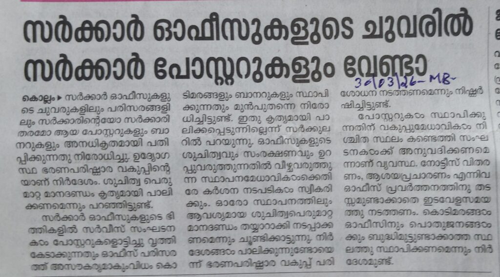 സർക്കാർ ഓഫീസുകളുടെ ചുവരിൽ സർക്കാർ പോസ്റ്ററുകളും വേണ്ട By admin | 02/04/2026 - 10:25 AM |02/04/2026 SOCIAL Bookmark the permalink.