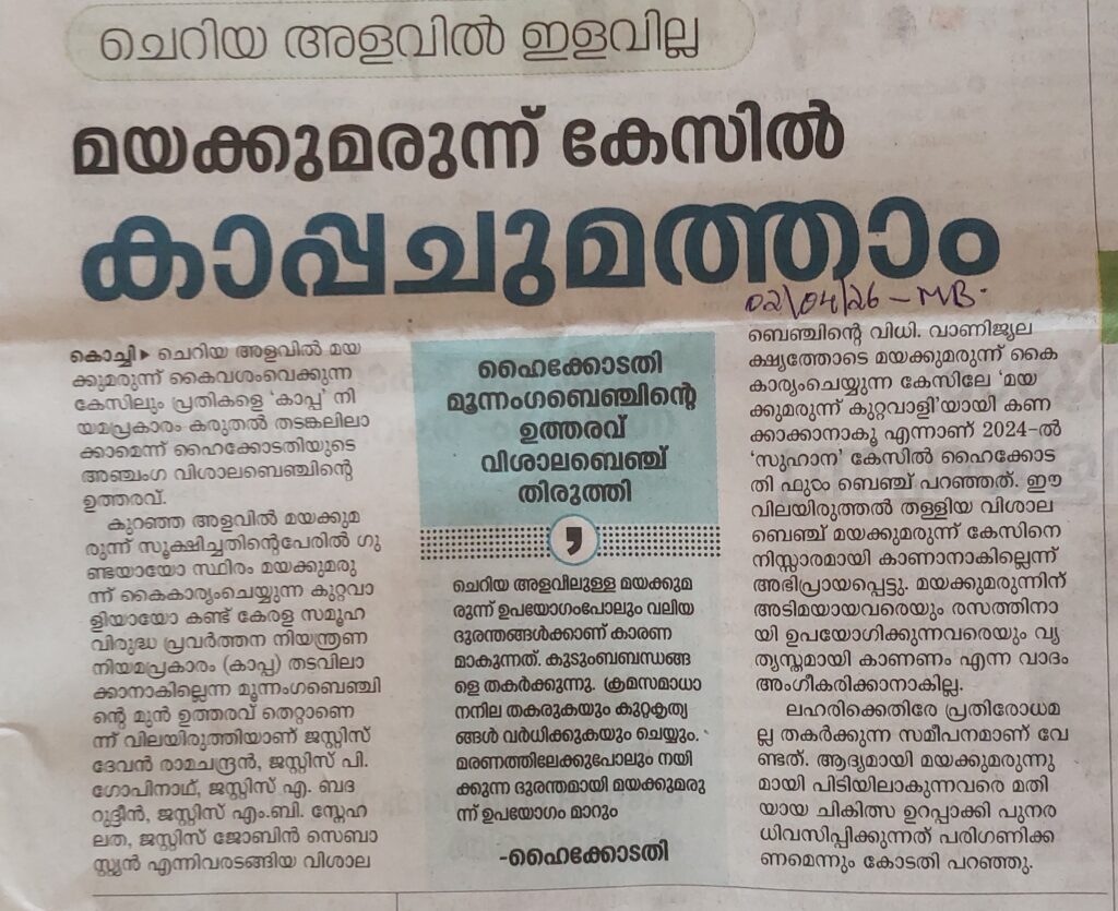 മയക്കുമരുന്ന് കേസിൽ കാപ്പ ചുമത്താം By admin | 02/04/2026 - 11:00 AM |02/04/2026 JUDICIARY Bookmark the permalink.