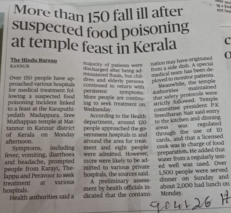 More than 150 fall ill after suspected food poisoning at temple feast in Kerala By admin | 10/04/2026 - 11:21 AM |10/04/2026 SOCIAL Bookmark the permalink.