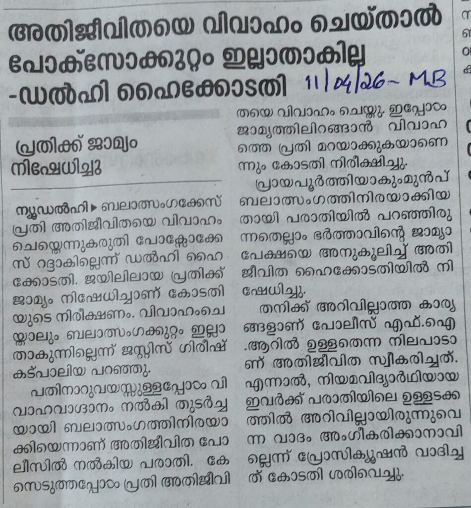 അതിജീവിതയെ വിവാഹം ചെയ്താൽ പോക്സോ കുറ്റം ഇല്ലാതാകില്ല – ഡൽഹി ഹൈക്കോടതി By admin | 16/04/2026 - 1:19 PM |16/04/2026 JUDICIARY Bookmark the permalink.