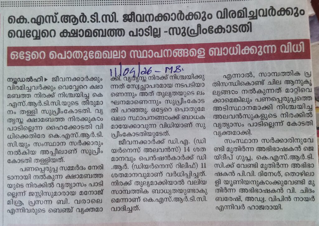 ജീവനക്കാർക്കും വിരമിച്ചവർക്കും വെവ്വേറെ ക്ഷാമബത്ത പാടില്ല – സുപ്രീം കോടതി By admin | 16/04/2026 - 1:24 PM |16/04/2026 JUDICIARY Bookmark the permalink.
