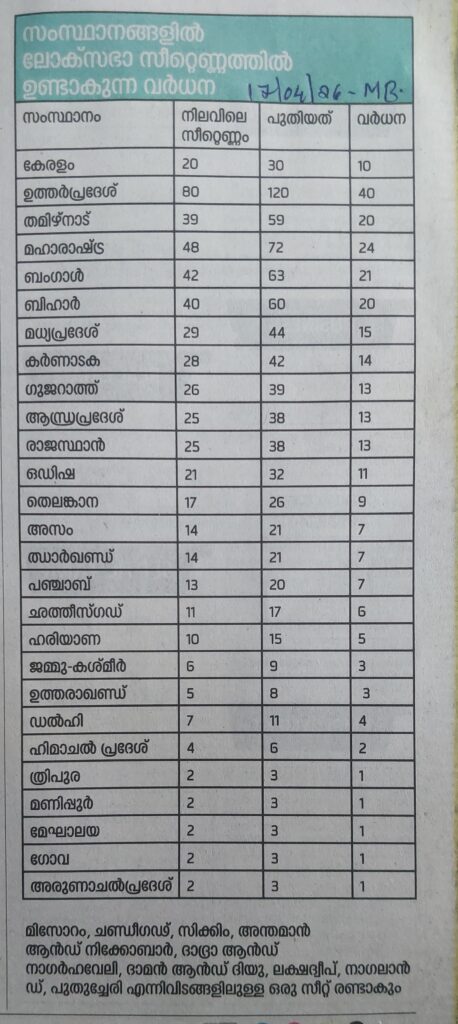 സംസ്ഥാനങ്ങളിൽ ലോക്സഭാ സീറ്റിൽ ഉണ്ടാകുന്ന വർധന By admin | 17/04/2026 - 10:50 AM |17/04/2026 SOCIAL Bookmark the permalink.